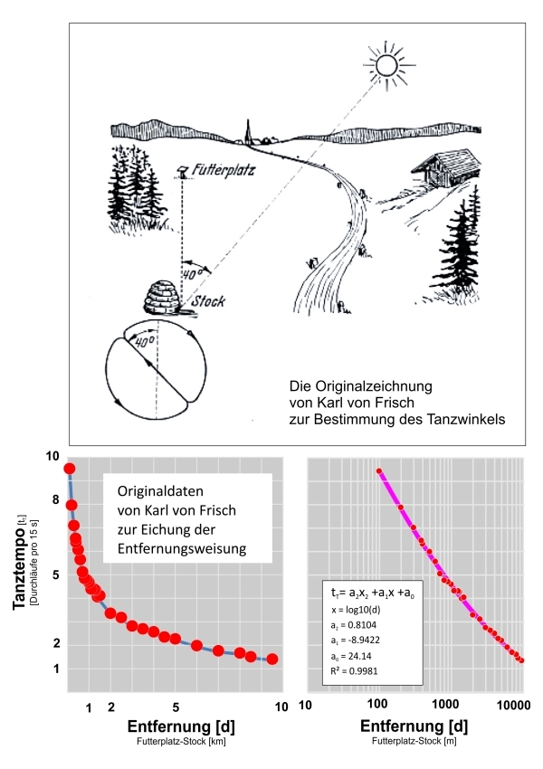 Frisch, K.v., Kratky, O. (1962) Über die Beziehung zwischen Flugweite und Tanztempo bei der Entfernungsmeldung der Bienen. Naturwissenschaften 49/18, S. 409-417.