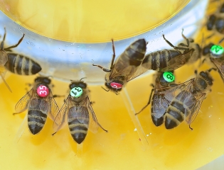 Wir stellten ein Stativ mit dem Zuckerwasserschälchen direkt vor dem Flugloch auf, was unsere Bienen, die noch nicht mit dem natürlichen örtlichen Futterangebot vertraut waren, sofort annahmen. Um sie identifizieren zu können, markierten wir die Futterplatzbesucherinnen am Rücken mit verschiedenfärbigen Nummernplättchen, wie sie sonst für das Zeichnen der Bienenköniginnen Verwendung finden.