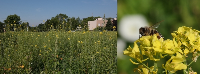 Wir haben die 100 m erreicht, die markierten Bienen kommen immer wieder zum Futterplatz zurück und sind auch im Bienenstock anzutreffen. Wahrscheinlich ist es das reichhaltige natürliche Trachtangebot, das für die anderen Bienenvölker interessanter ist, weswegen sie unseren Futterplatz ignorieren. Am Samstag schaffen wir mit unseren Bienen die Hürde über die Baumreihe zwischen unserem Standort und der „Hundewiese“. 175 m Entfernung vom Stock sind erreicht, ungefähr 300 Bienen sind markiert, der Appetit wird immer größer. Wenn das Futter zur Neige geht, haben sie noch eine eigene Taktik entwickelt, um die im Gras ruhenden ExperimentatorInnen darauf aufmerksam zu machen: sie „umschwärmen“ diese (es stellt sich die Frage, wer eigentlich wen dressiert hat).